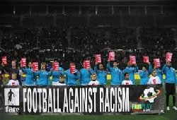 Turkish football team players display anti-racism posters prior a friendly match against Austria, in November 2008, in Vienna.